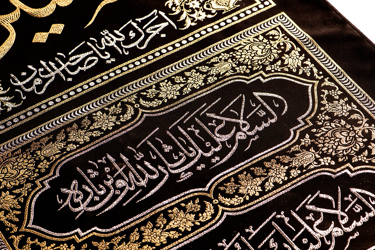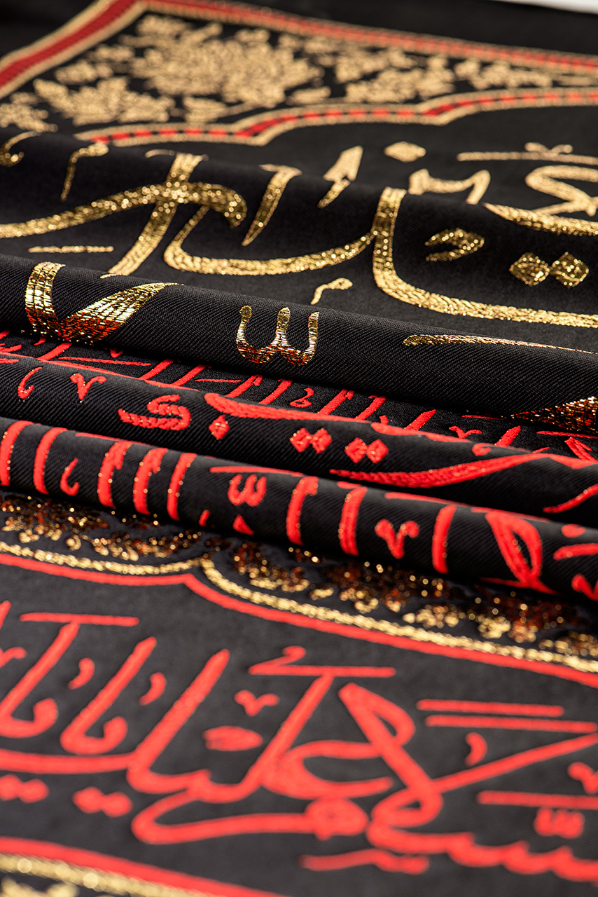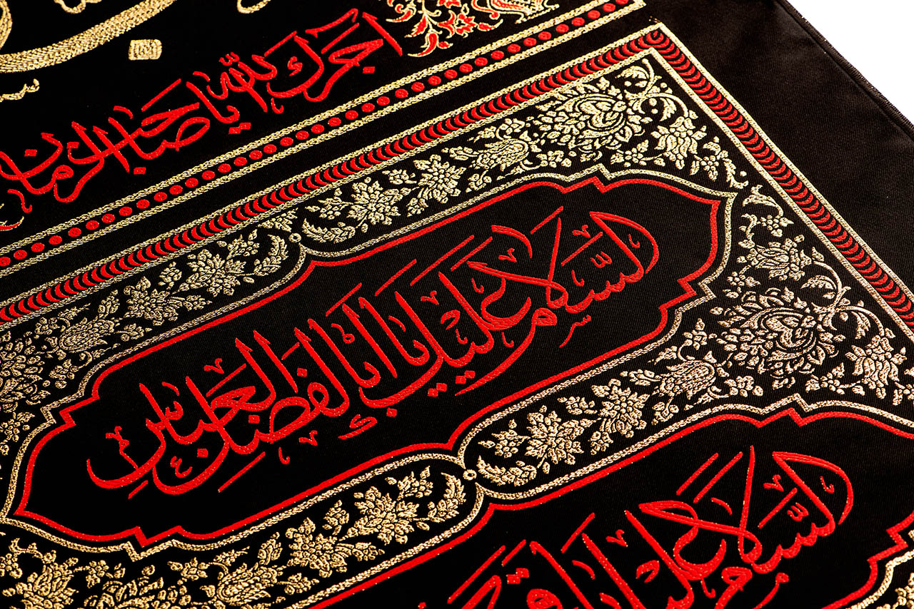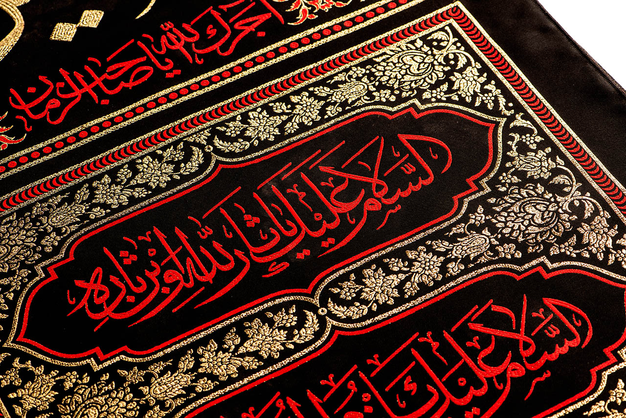 پلاکارد افقی محرم کد 1 ناحیه مزین به فرازهای ناحیه مقدسه آذینی که نیایش های منتقم خون ثارالله را در یوم الظهور فریاد برآورده است تالیفی از کتابت زربافت و تزئینی برای مجالس منتسب به آن امام همام قرائت نجوا گونه امام منتقم در مجالس آل الله زمینه ای برای حضور قلب و تقرب بر آستان عظیم کبریایی