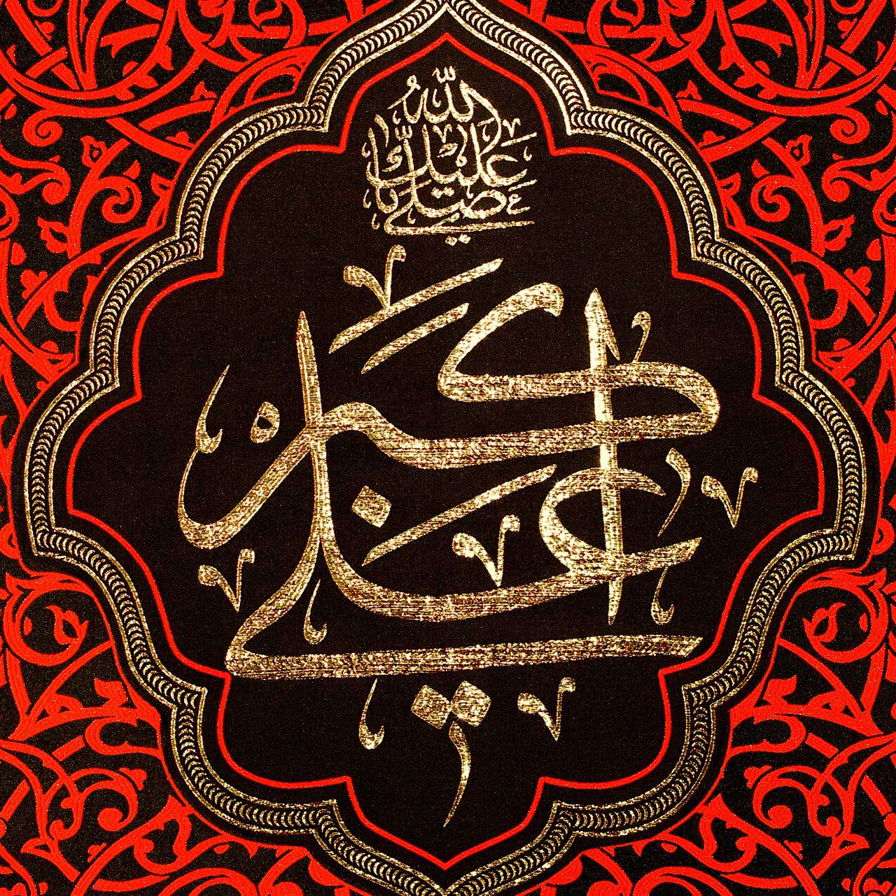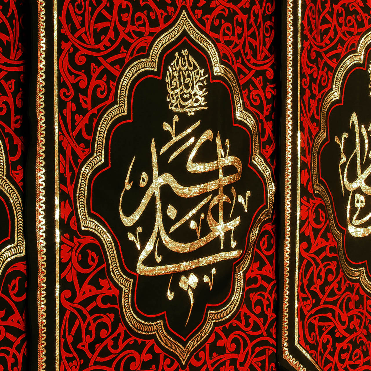پلاکارد افقی محرم کد 1 ناحیه مزین به فرازهای ناحیه مقدسه آذینی که نیایش های منتقم خون ثارالله را در یوم الظهور فریاد برآورده است تالیفی از کتابت زربافت و تزئینی برای مجالس منتسب به آن امام همام قرائت نجوا گونه امام منتقم در مجالس آل الله زمینه ای برای حضور قلب و تقرب بر آستان عظیم کبریایی